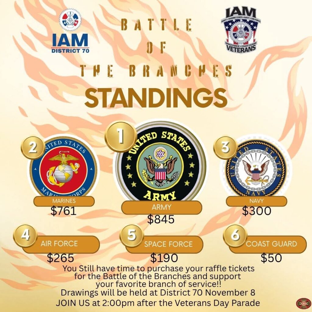 The Veteran’s Committee is hosting a raffle. Tickets are only $5 each and are available through our Veterans Committee members, including our very own Russell Brennan in 46 pre-integration on 2nd Shift. You can also purchase tickets at the monthly meetings and at District 70. Please spread the word as all proceeds go to Passageways and IAM Veterans. Please share this information. Baskets are still having items added.